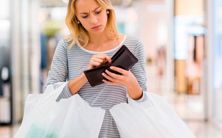 Девушка с пакетами огорчённо смотрит в пустой кошелёк